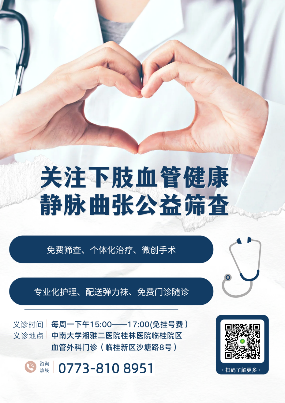 临桂院区血管外科门诊于每周一下午15:00-17:00,面向静脉曲张患者推出专项便民服务:患者可享受免收挂号费福利及专业基础筛查,由专科医师一对一提供病情精准评估、个性化治疗建议及长期健康管理方案,帮助患者科学应对疾病困扰。接受手术治疗的患者,将免费获赠下肢抬高垫及医用弹力袜。射频消融术治疗周期短,患者住院仅需2~4天即可完成治疗,能最大程度减少对日常生活的影响,欢迎有需求的患者前来咨询就诊。