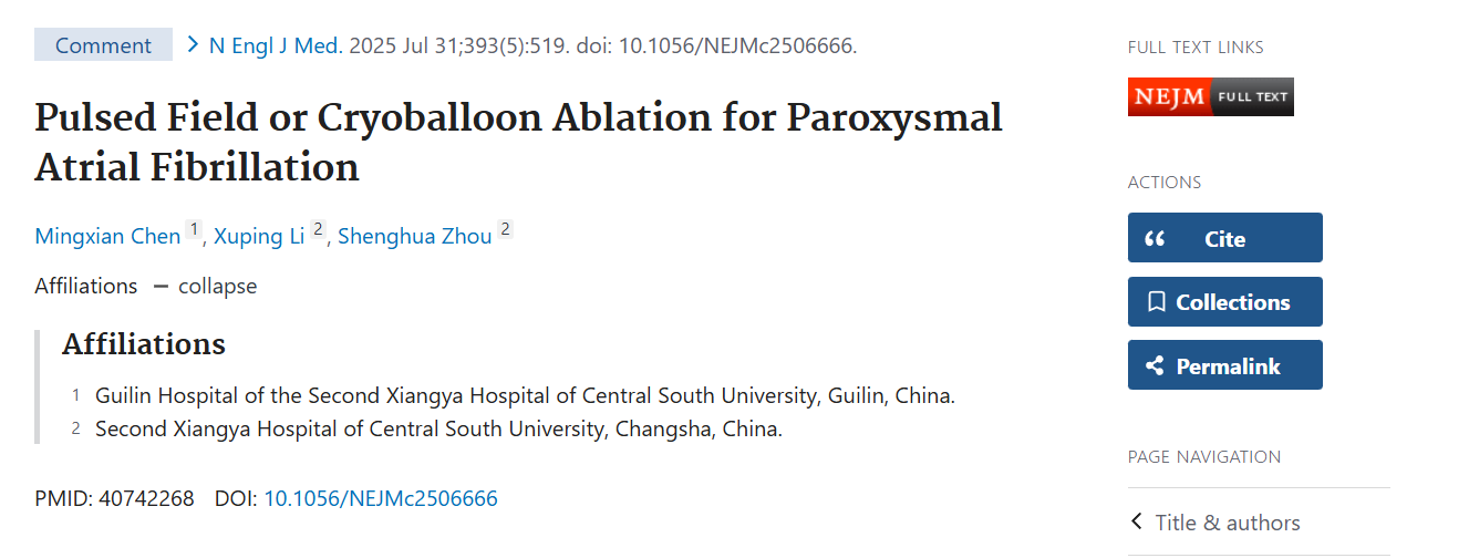 近日,中南大学湘雅二医院桂林医院心血管内科在国际医学界公认的顶级期刊《新英格兰医学杂志》(TheNewEnglandJournalofMedicine,NEJM)(影响因子IF=78.5)上发表重要学术观点文章《PulsedFieldCryoballoonAb...