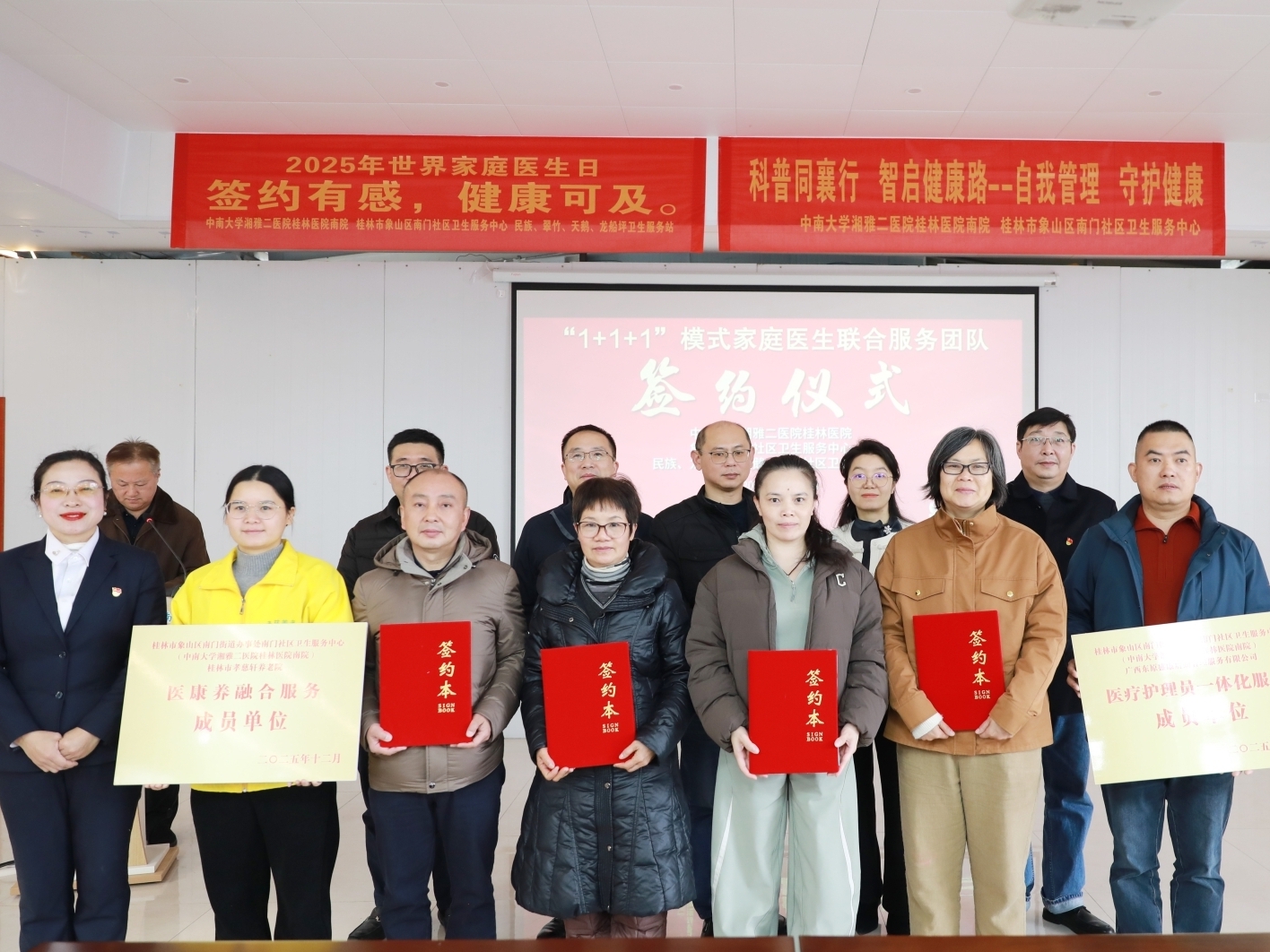 冬日暖阳暖人心,健康服务暖万家。近日,在党建引领基层医疗卫生服务提质增效的工作部署下,中南大学湘雅二医院桂林医院南院(桂林市象山区南门社区卫生服务中心)内人头攒动、暖意融融,“‘1+1+1’家庭医生签约服务”“医康养融合”“医疗护理员一体化”三项医疗惠民服务签...